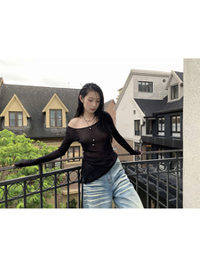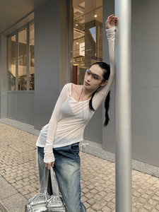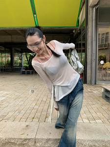 [9hour]甜辣风抽褶绑带t恤女 2025秋季别致微透长袖上衣女c250364