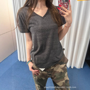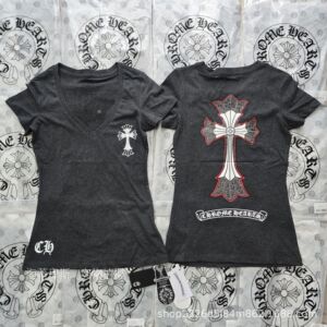 正确版CH克罗梵文复古印花V领短袖修身显瘦收腰纯欲辣妹风短t女
