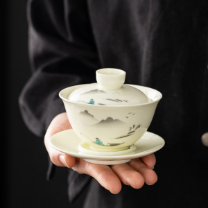 白瓷三才盖碗青花瓷陶瓷功夫盖碗茶具茶杯碗青瓷手抓壶泡茶碗