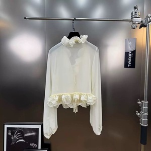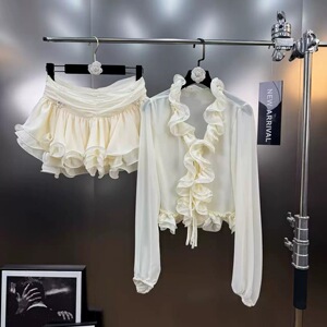 2025年早秋新款百搭显瘦荷叶边长袖雪纺衫上衣蓬蓬多层半裙套装