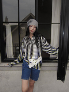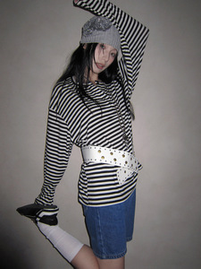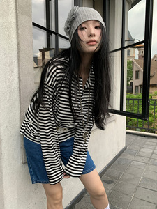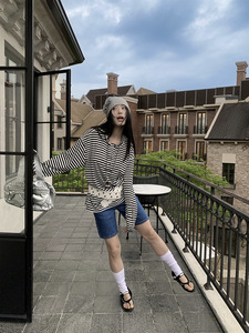 [9hour]美式洋气半排扣条纹t恤女 2025秋季长袖天丝上衣女c250322