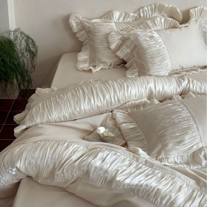 法式宫廷风米白色全棉四件套琉璃纱少女花边长绒棉床单被套四季款