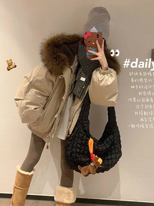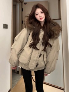 牛角扣大毛领连帽棉服外套女短款冬季韩系小个子加厚工装派克服