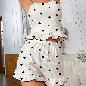 Women's Strawberry Print Sexy Ribbed Frill Trim Pajama Set