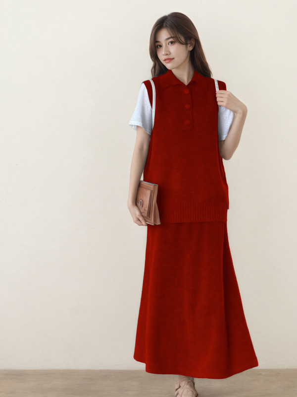 两件套2025年冬款季新款针织套装女翻领背心马甲+长裙奢缇家毛衣