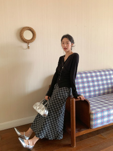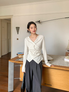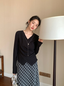 起范V领设计感不规则交叉长袖收腰显瘦短款打底衫广州十三行86296
