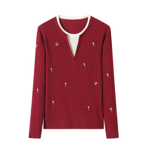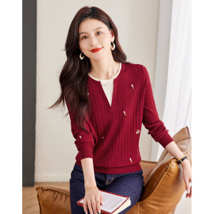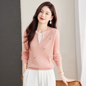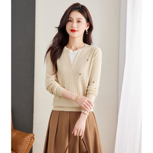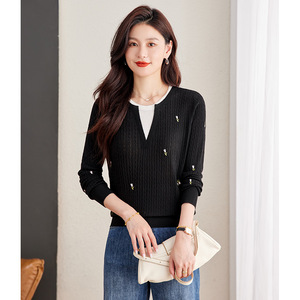 2025早秋新款撞色假两件针织衫女刺绣休闲长袖上衣小个子打底衫薄