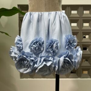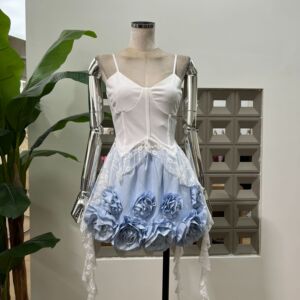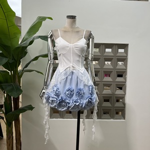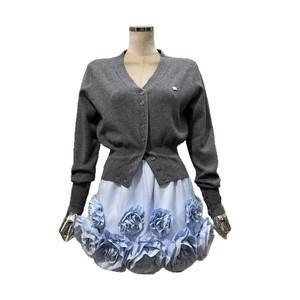 亚马逊高级灰收腰针织开衫+蕾丝飘带吊带+手工花朵条纹重工半裙