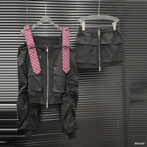 2025新款设计女装领带时尚套装女小众一字领露肩短外套+短裙两件