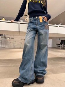 老花阔腿牛仔裤复古中高腰水洗蓝宽腿裤直筒裤显高显瘦低调时髦款