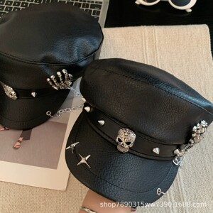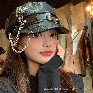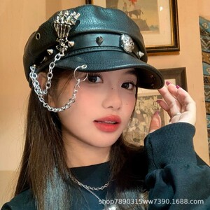 暗黑朋克风铆钉皮质黑色贝雷帽女亚文化辣妹显脸小画家帽子潮