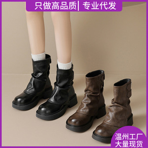 高品质复古美拉德短靴女春秋单靴2025新款厚底棕色裤管骑士马丁靴