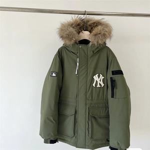 韩国跨境MLB羽绒服洋基队工装大毛领中长款男女款白鸭绒派克外套