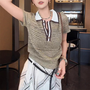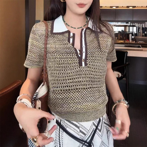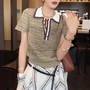 撞色镂空polo领短袖针织衫女夏季2025新款时尚设计感小众绝美上衣