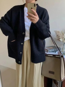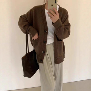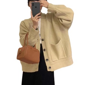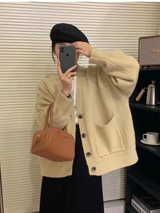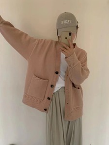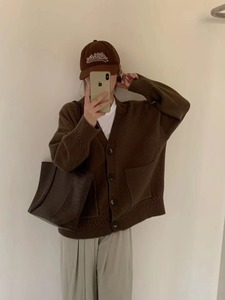 新款纯色麻花口袋针织开衫女高级感罗纹褶皱慵懒宽松软糯毛衣外套