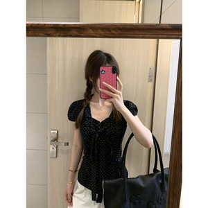法式复古波点蝴蝶结短袖衬衫女夏季设计感小众修身显瘦泡泡袖上衣