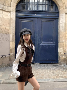 小香风~学院感咖色粗花呢背带裤+莱赛尔白色衬衫两件套女装套装秋