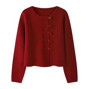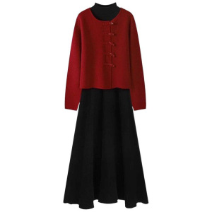 慵懒短款宽松牛角扣红色毛衣外套女2025秋冬收腰针织连衣裙两件套