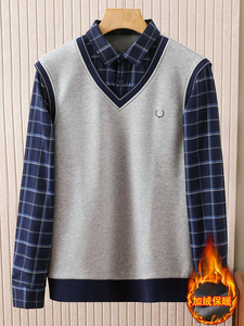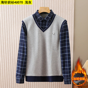 新款海牌剪标水貂绒加绒假两件针织衫男冬季衬衫领毛衣男装4U070