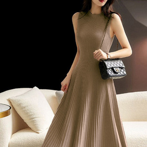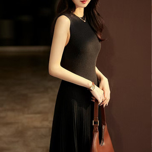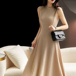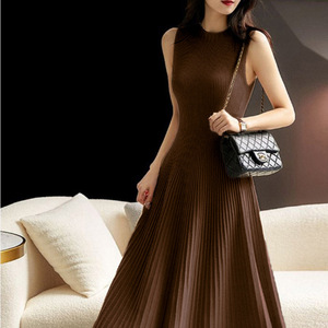 2025年秋冬新款100羊毛圆领针织无袖连衣裙女抽条显瘦百褶长裙