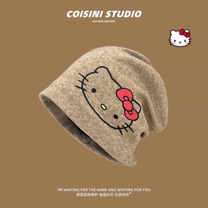 可爱KT猫包头帽子女春秋薄款日常百搭大头围显脸小套头冷帽堆堆帽