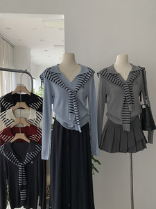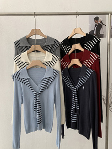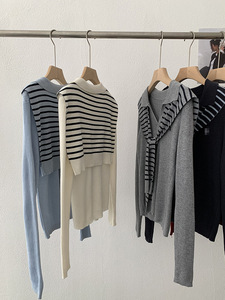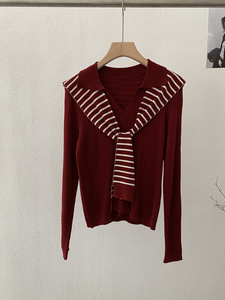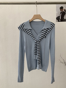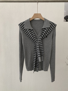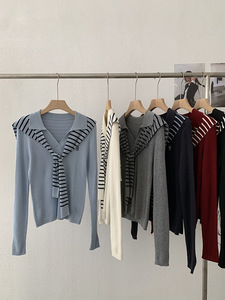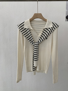 欧玛莱 翻领小马刺绣修身显瘦长袖针织衫搭条纹披肩两件套女 4260