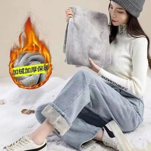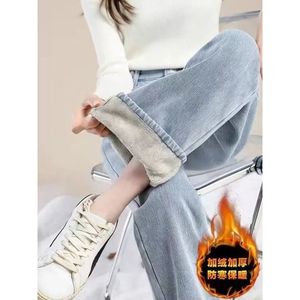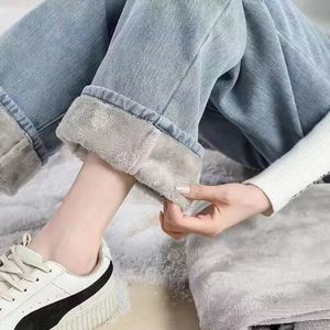 加绒加厚2025牛仔裤女冬季新款高腰女式宽松显瘦保暖直筒阔腿