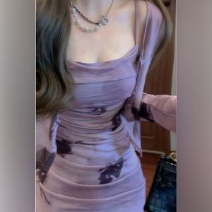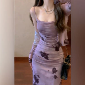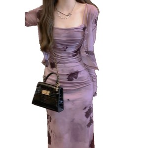 新中式秋款法式复古紫色水墨吊带裙两件套高级感气质修身连衣裙子