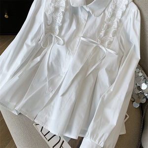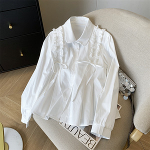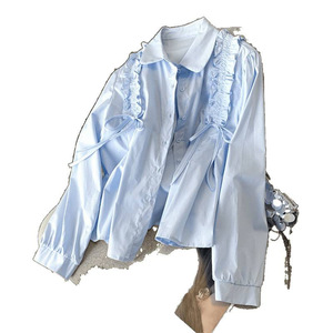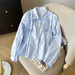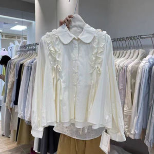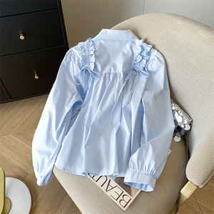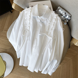 韩系甜美简约设计感别致上衣女春秋季显瘦宽松花纹蝴蝶结时尚衬衣