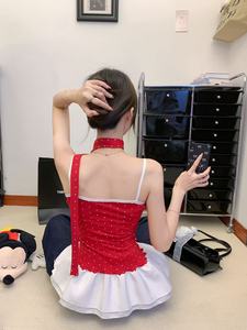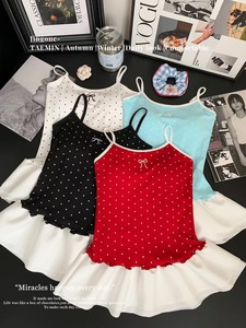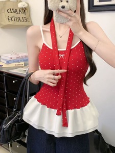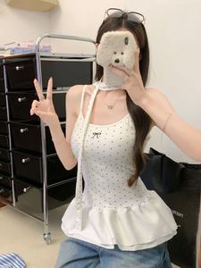 韩系风波点吊带背心女夏季新款甜美蝴蝶结带飘带荷叶边修身上衣