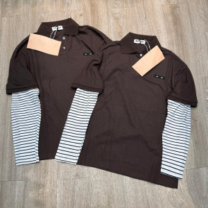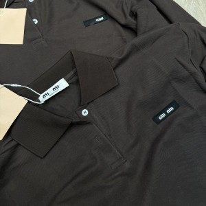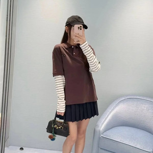 正确版原标MIU缪家字母刺绣假两件条纹拼接宽松翻领长袖T恤POLO衫