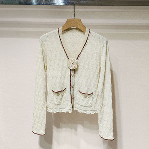 1件起批2025秋女装 V领立体花朵单排扣口袋针织开衫上衣S250626