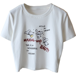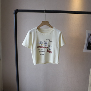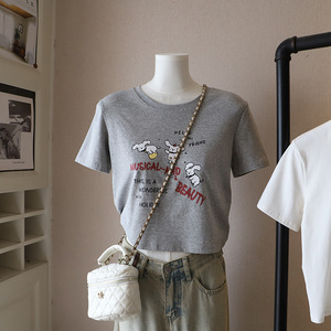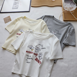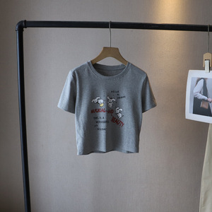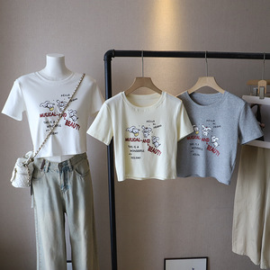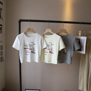 [比正]2025夏季新款韩版圆领卡通字母印花显瘦短款短袖T恤女4619