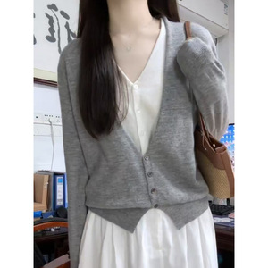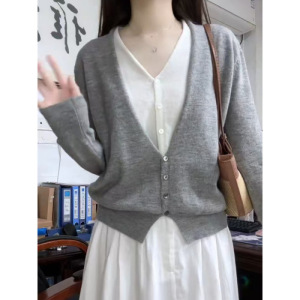 灰色V领假两件毛衣女早秋新款韩系宽松慵懒百搭高级感针织衫上衣