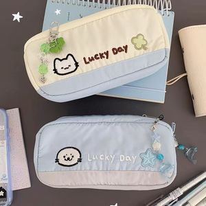 日系可爱四叶草幸运小猫刺绣笔袋ins大容量学生文具收纳袋铅笔盒