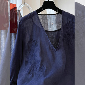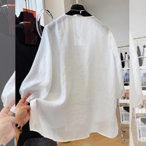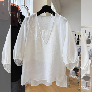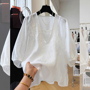 极简风夏季新款纯色刺绣假两件微透宽松衬衫女五分袖显瘦百搭上衣