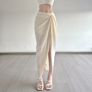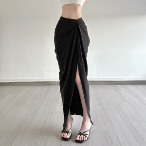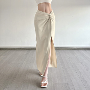 2025欧美夏季跨境新款高腰纯色收腰开叉扭结修身包臀气质半身裙女