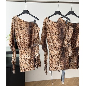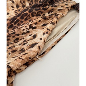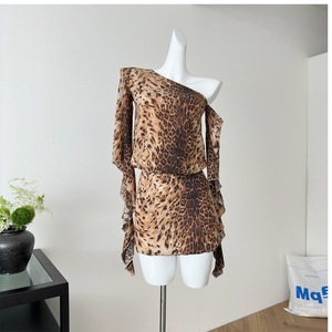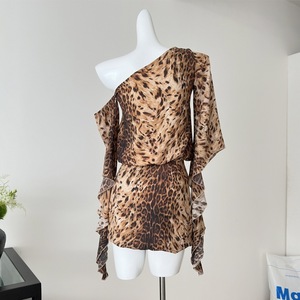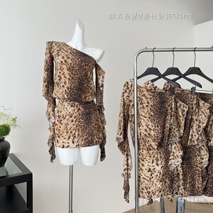 女款夏2025春夏新款豹纹印花斜裁雪纺荷叶边袖低腰包臀连衣裙斜领