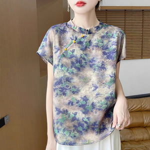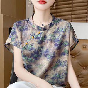 新中式立领高端缎面复古提花T恤女夏季清凉透气宽松减龄短袖上衣