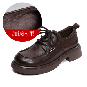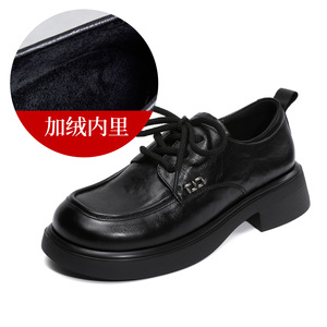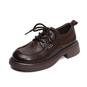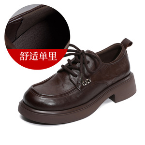 头层牛皮圆头系带乐福鞋女2025秋季新款轻奢手抓纹深口单鞋小皮鞋
