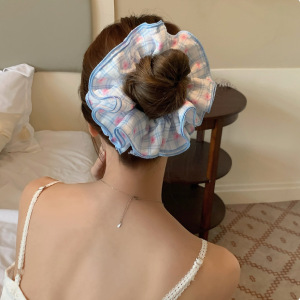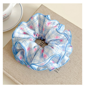 蓝格子花花!雪纺大肠圈发绳多层花边甜美花苞发圈头绳丸子头发饰