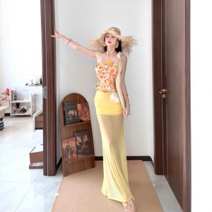 夏日度假风露肩短款抹胸上衣半身裙两件套女装巨好看显瘦辣妹套装