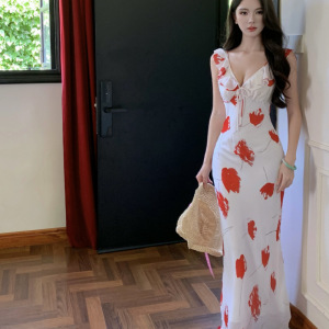 红玫瑰印花V领雪纺连衣裙女2025夏新款设计感小心机度假风长裙子