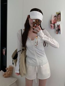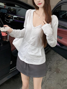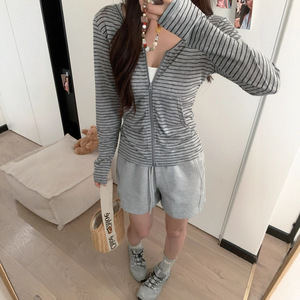 慵懒风条纹拉链长袖连帽开衫外套女夏季修身百搭休闲防晒罩衫上衣