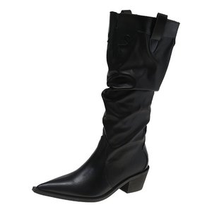 尖头西部牛仔靴女2025新款秋冬褶皱堆堆不过膝长靴粗跟高筒骑士靴