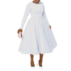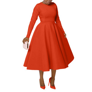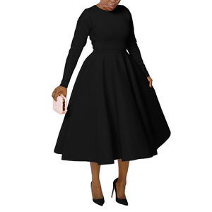N8128外贸女装2025秋冬新款 气质优雅纯色圆领长袖刀背大摆连衣裙