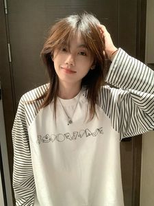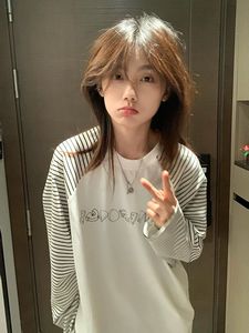 美式复古字母印花条纹长袖t恤女早秋新款设计感小众潮牌宽松上衣