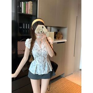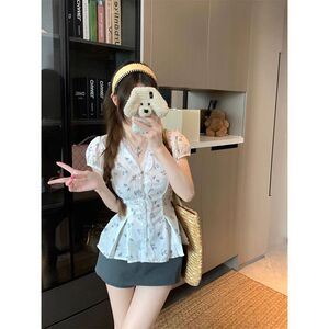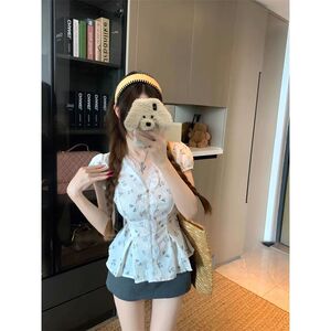 蕾丝拼接v领短袖碎花衬衫女夏季法式修身衬衣温柔风小众显瘦上衣