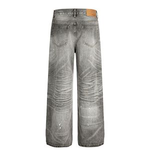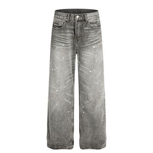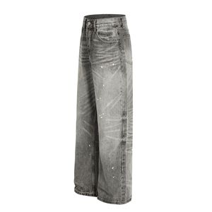 FX085美式高街复古男女高级感水洗灰泼墨旧感设计男式宽松牛仔裤