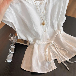 白色系带收腰圆领无袖修身衬衫女2025夏季新款显瘦上衣清爽透气